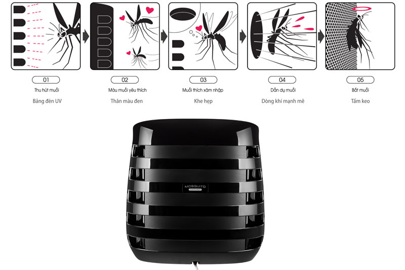 Đèn UV thu hút muỗi, dẫn dụ muỗi di chuyển vào bên trong các khe hẹp + đen trên máy, bắt muỗi với luồng khí mạnh và giữ muỗi bằng tấm dính, đảm bảo không gian gia đình sạch bóng muỗi, cho bé yêu giấc ngủ sâu suốt đêm.