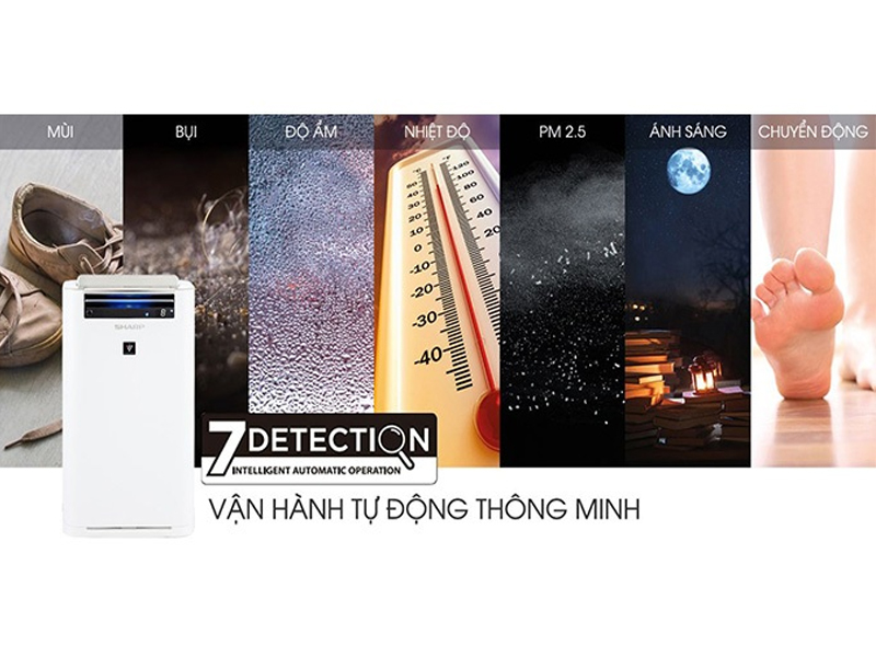 Máy vận hành tự động thông minh 7 cảm biến được tích hợp bao gồm cảm biến bụi, mùi, cảm biến PM 2.5 phát hiện bụi cực nhỏ, cảm biến nhiệt độ – độ ẩm, cảm biến ánh sáng và chuyển động.