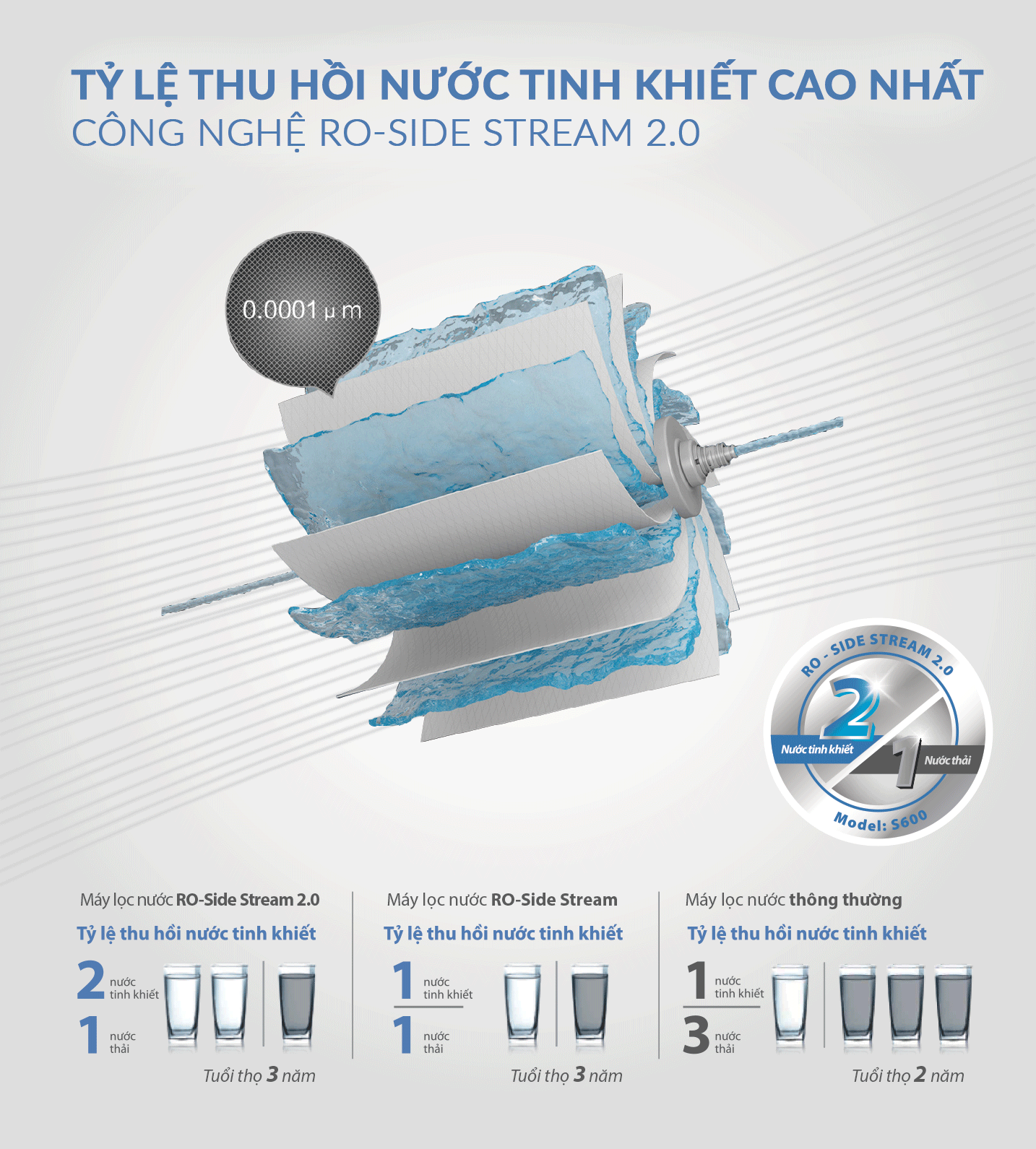 Màng lọc RO – Side Stream đã được coi là phát minh sáng chế đột phá của A.O. Smith giúp tăng khả năng thu hồi nước tinh khiết lên tới 1 nước tinh khiết máy lọc nước đặt bàn S600: 1 nước thải. Không dừng lại ở đó, A.O Smith tiếp tục nghiên cứu và phát triển màng lọc RO – Side Stream 2.0 thế hệ mới cho tỉ lệ thu hồi tăng lên 2 nước tinh khiết : 1 nước thải, cao nhất trên thị trường máy lọc nước AO Smith S600.