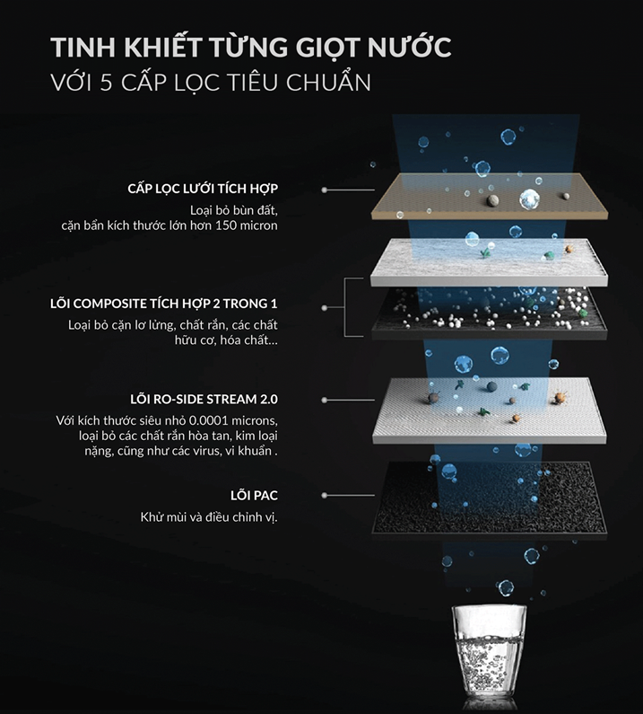Nguồn nước tinh khiết với 5 cấp lọc ưu việt được tích hợp trong 3 lõi đặc biệt