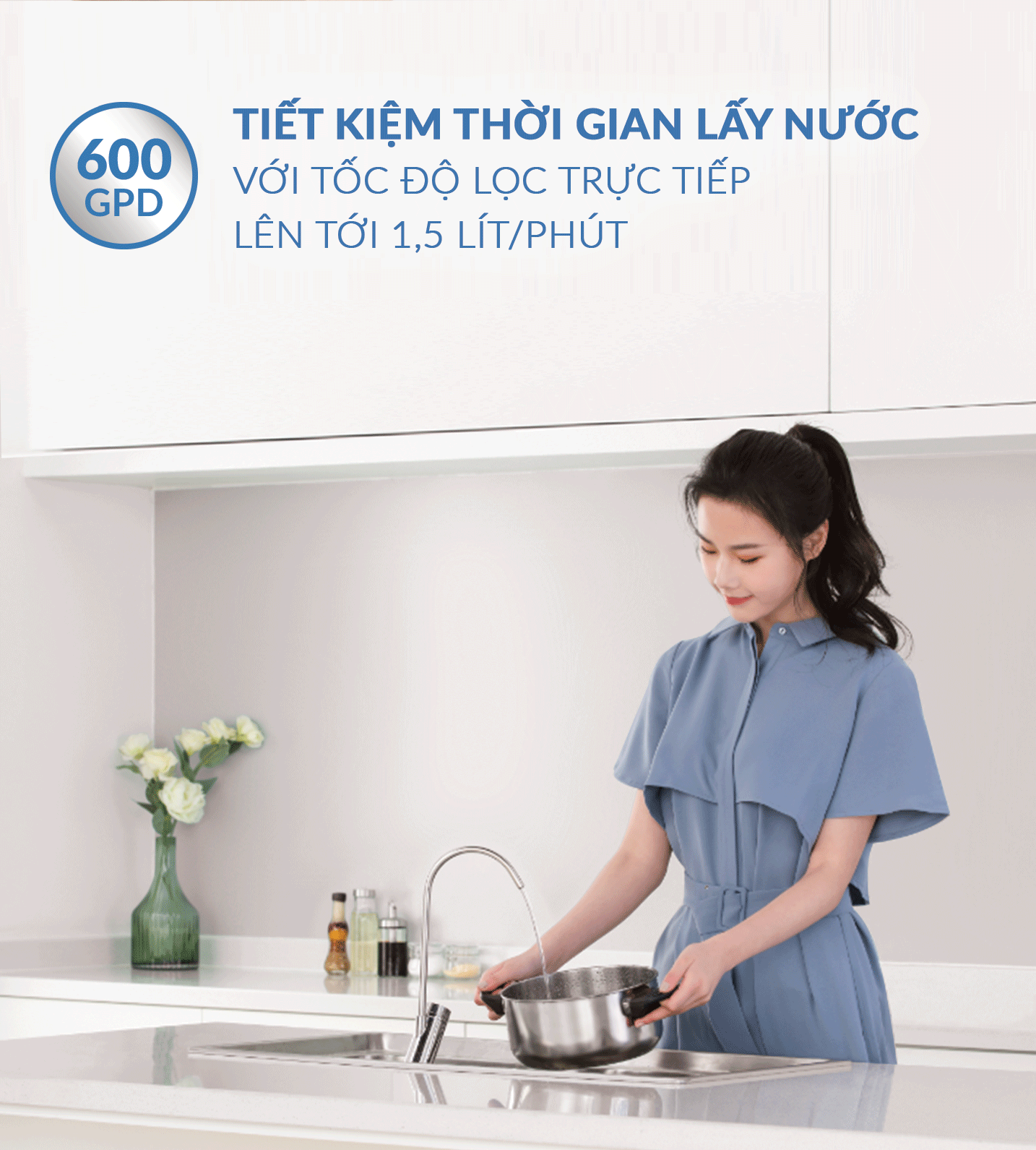 Sản phẩm A.O Smith S600 sử dụng màng lọc 600GPD cho công suất lọc vượt trội 1500ml/phút tương đương 94 lít/giờ, cao gấp 9 lần so với máy lọc nước thông thường, cung cấp nguồn nước tinh khiết liên tục, đáp ứng nhu cầu sử dụng của cả gia đình. Nhờ đó, máy lọc nước đặt bàn AO Smith S600 bạn có thể lấy nước sử dụng nhanh chóng, không cần chờ đợi lâu dù không có bình chứa, điều này góp phần giúp máy mỏng gọn hơn. Hơn thế nữa, nước luôn được lọc mới tại chỗ nên bạn không cần lo lắng việc nước để lâu trong bình chứa bị tái nhiễm khuẩn, biến đổi mùi vị.