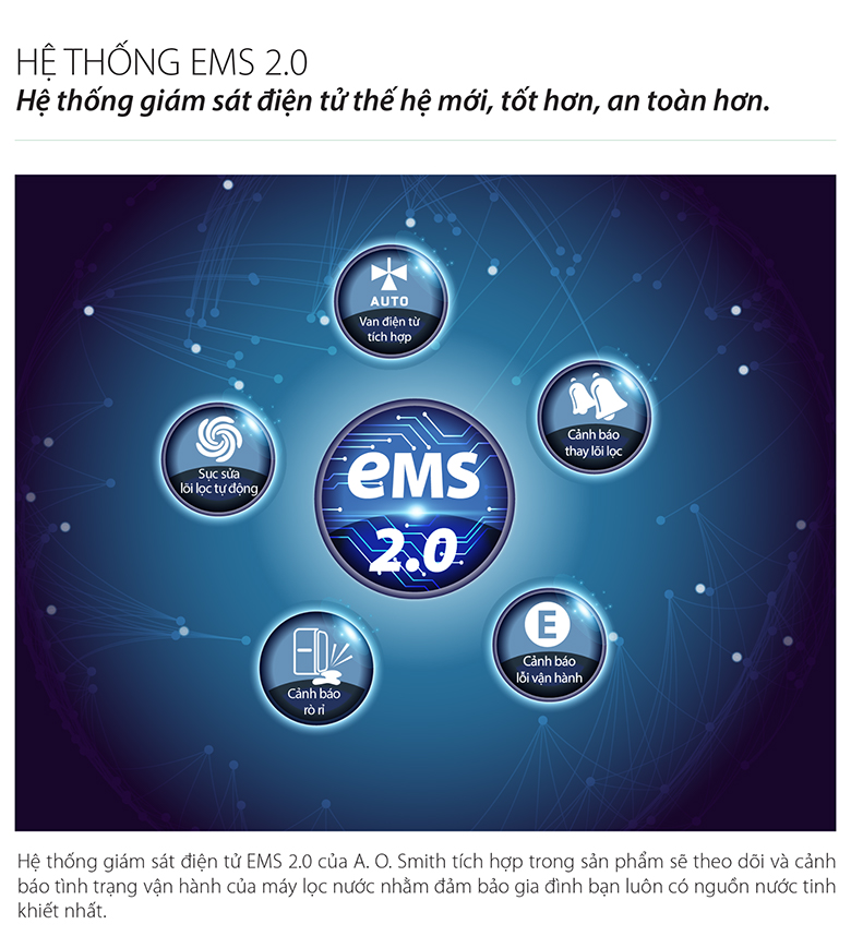 Máy lọc nước A. O. Smith G1 được trang bị hệ thống giám sát điện tử EMS 2.0, liên tục theo dõi và cảnh báo tình trạng vận hành của máy, đảm bảo máy luôn hoạt động tốt nhất. EMS 2.0 sẽ thông báo khi cần bảo trì hoặc thay lõi lọc, giúp duy trì chất lượng nước tinh khiết và đảm bảo máy lọc nước hoạt động bền bỉ theo thời gian, mang lại sự an tâm tuyệt đối cho người dùng.