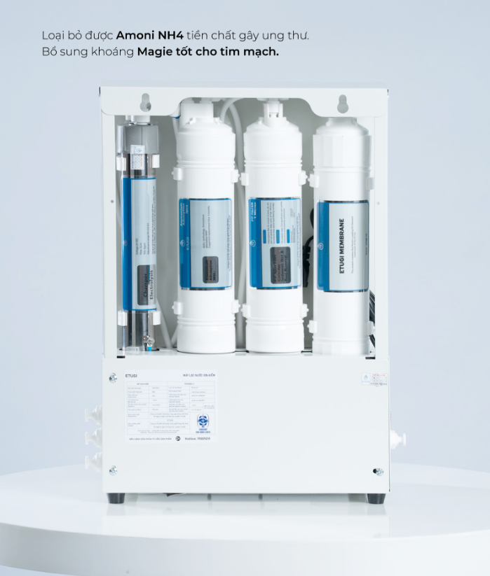 Hiện nay trên thị trường máy lọc nước ion kiềm thì Etugi chính là đơn vị tiên phong đi đầu trong lĩnh vực điện phân trực tiếp nước R.O mà không cần sử dụng lõi tạo kiềm hay lõi tạo khoáng. Sản phẩm sau điện phân là nước tốt với pH từ 8.5 – 9.5 giàu Hydrogen phân tử, thế oxi hóa khử ORP âm, cụm phân tử nước nhỏ và đặc biệt chứa hàm lượng khoáng Magie tốt cho sức khỏe tim mạch.