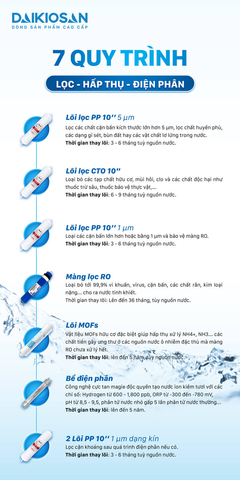 Máy lọc nước ion kiềm tươi Daikiosan DN105 sở hữu 7 quy trình lọc, hấp thụ, điện phân bậc nhất hiện nay:
