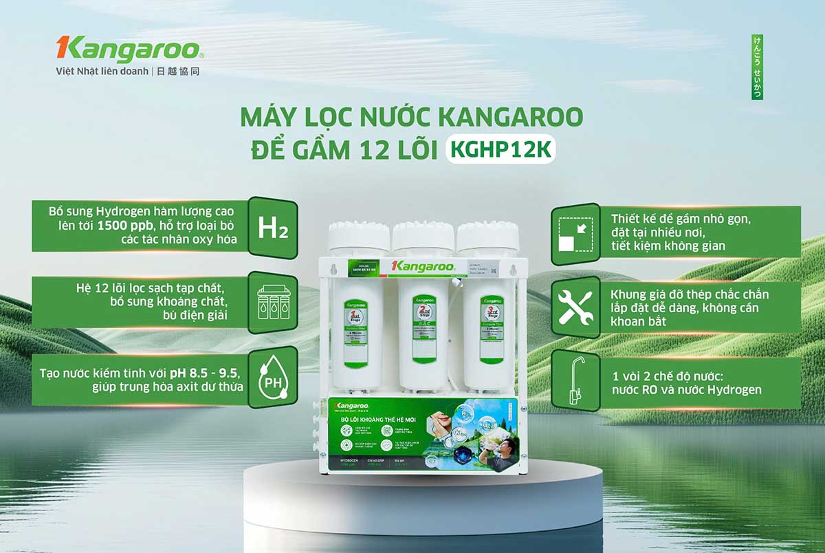 Máy lọc nước Hydrogen Kangaroo KGHP12K có thiết kế gọn nhẹ, là dòng máy để gầm duy nhất cung cấp 2 chế độ nước: nước Hydrogen – nước RO. Với 12 lõi lọc mạnh mẽ, KGHP12K tạo nước khỏe có độ kiềm pH 8.5 – 9.5, giúp trung hòa axit dư thừa và loại bỏ các tác nhân oxy hóa nhờ hàm lượng Hydrogen cao.