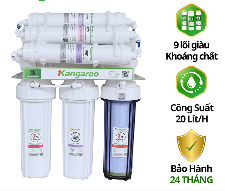 Máy lọc nước Kangaroo Hydrogen KG100ESGUS9 có 9 cấp lọc mạnh mẽ, loại bỏ 99,99% vi khuẩn và cân bằng pH cho nước. Màng lọc RO Vortex công nghệ dòng chảy xoáy giúp giảm đóng cặn bề mặt màng, tăng tuổi thọ lên tới 3 lần