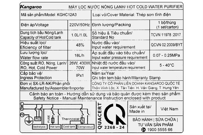 Kangaroo KGHC12A3 sử dụng công nghệ điện phân nước RO độc quyền và đầu tiên trên thị trường Việt Nam. Dòng sản phẩm máy lọc nước Kangaroo Sumire Series 2024 đã được kiểm chứng có các chỉ số nước Hydrogen ion kiềm vượt trội tốt cho sức khỏe.