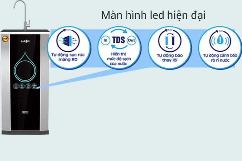 – Khi chỉ số TDS của nước sau lọc hiển thị cao hơn mức độ khuyến nghị, máy sẽ có tín hiệu từ màn hình LED và còi để cảnh báo. Màn hình hiển thị TDS của máy lọc nước thông minh Karofi iRO 2.0 giúp người dùng có thể thấy tường tận độ tinh khiết và chủ động kiểm soát được chất lượng nước trong mỗi lần sử dụng.