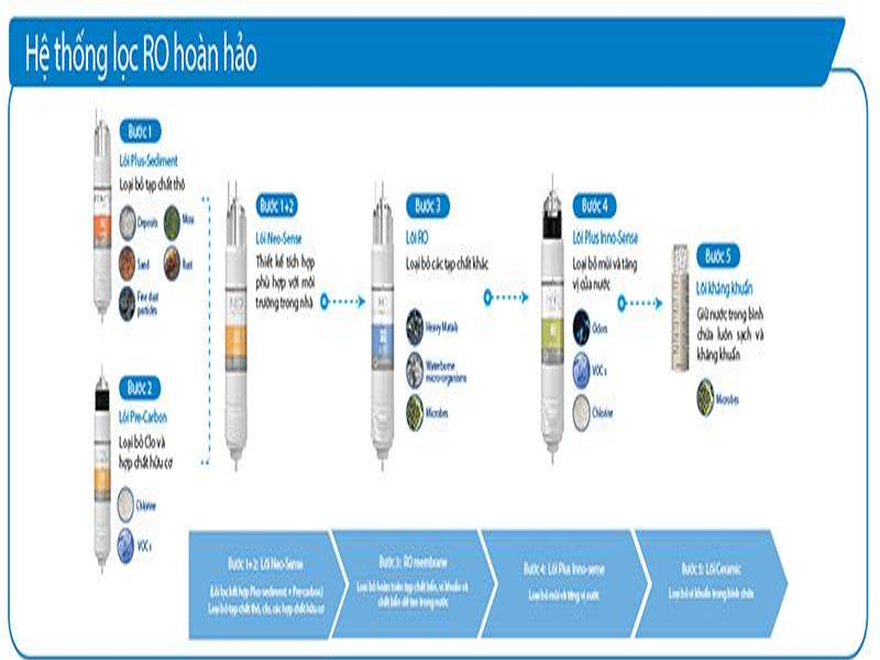 Lõi 1+2 : Lõi Neo-Sense thiết kế phù hợp với môi trường trong nhà gồm: Lõi Plus-Sediment loại bỏ tạp chất thô, Lõi Pre-Carbon loại bỏ Clo và hợp chất hữu cơ.