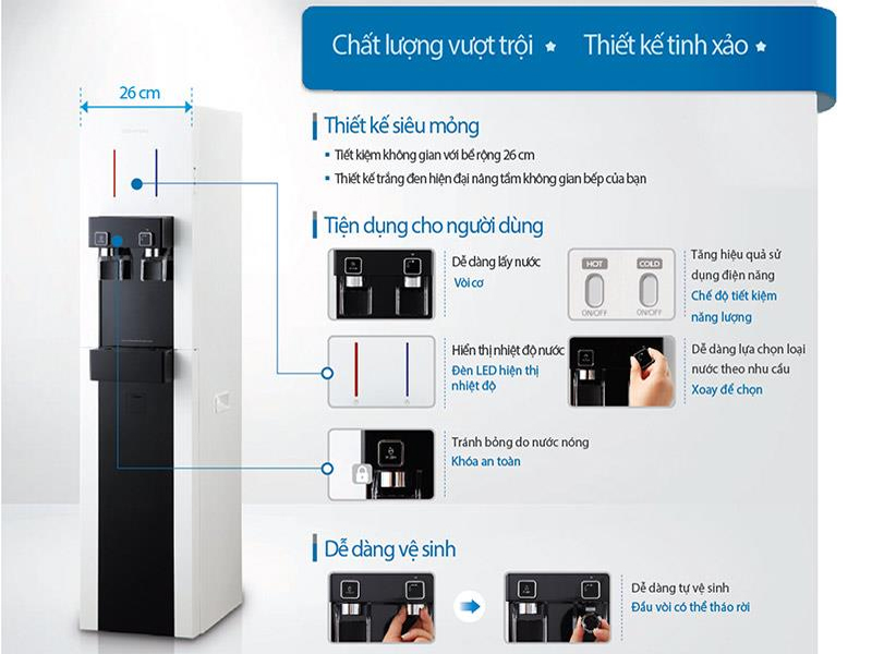 có màn hình hiển thị nhiệt độ đèn LED, khóa an toàn tránh bỏng tay, dễ dành chọn loại nước theo yêu cầu, có chế độ tiết kiệm năng lượng.