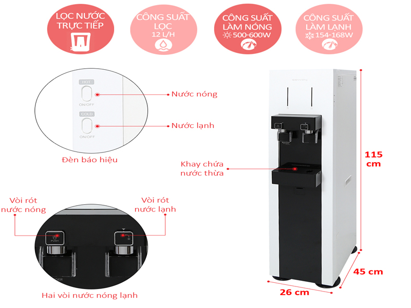 • Dung tích bình chứa: 12L : Nước thường 6L, Lạnh 3L, Nóng 3L