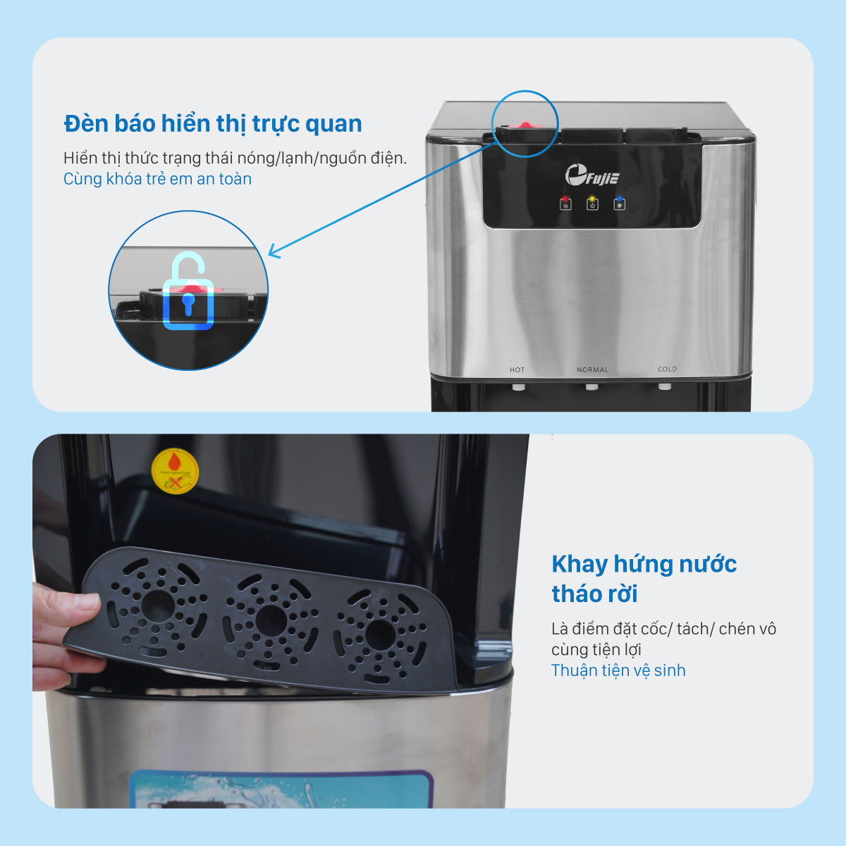 Máy còn được trang bị đèn báo nguồn và đèn báo từng chế độ nước giúp người dùng dễ dàng quan sát tình trạng máy. Khay hứng nước thừa được thiết kế dễ dàng tháo lắp và vệ sinh, mang lại sự tiện lợi trong quá trình sử dụng.