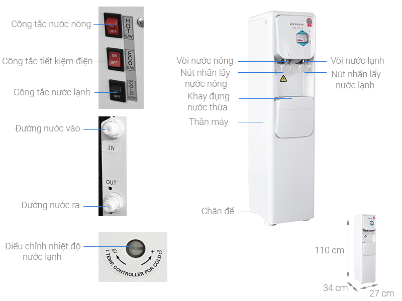 Công suất lọc 15 lít/giờ, bình chứa nước nóng 2 lít, bình chứa nước lạnh 3.2 lít. Chất liệu bình chứa bằng inox 304 cao cấp độ bền cao, trữ nước an toàn cho sức khỏe