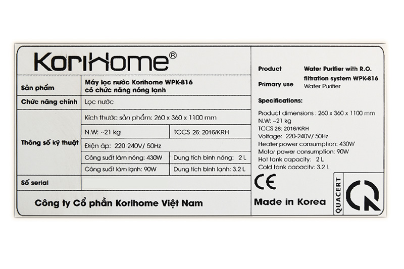 Máy lọc nước Korihome WPK-816 sản phẩm thương hiệu Hàn Quốc được sản xuất tại Hàn Quốc chất lượng cao, mẫu mã đẹp, xứng tầm với các không gian kiến trúc hiện đại.