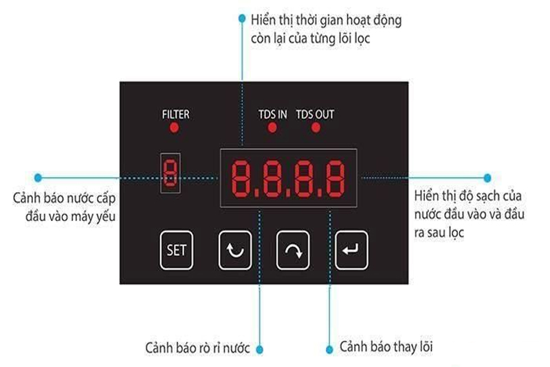 - Máy có khả năng cảnh báo thay lõi và thời gian thay lõi.