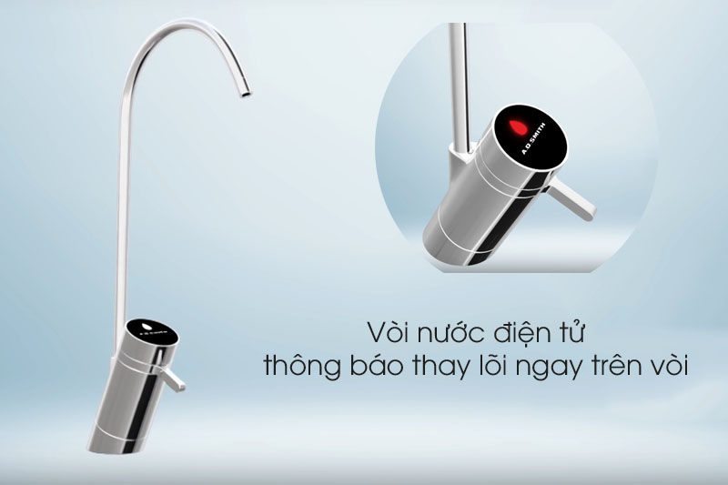 Vòi lấy nước điện tử, có chức năng thông báo thời gian thay lõi lọc ngay trên vòi nước giúp người dùng chủ động thay lõi lọc