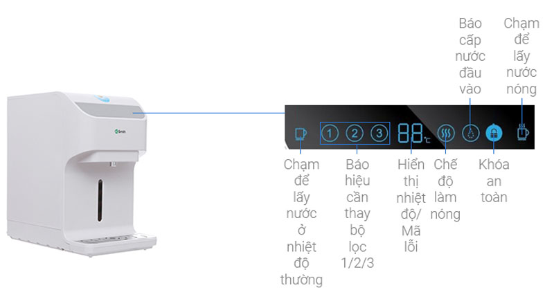 Bảng điều khiển cảm ứng hiện đại với màn hình Led hiển thị, chứa đầy đủ thông tin cần thiết để người dùng theo dõi và kiểm tra tình trạng máy lọc