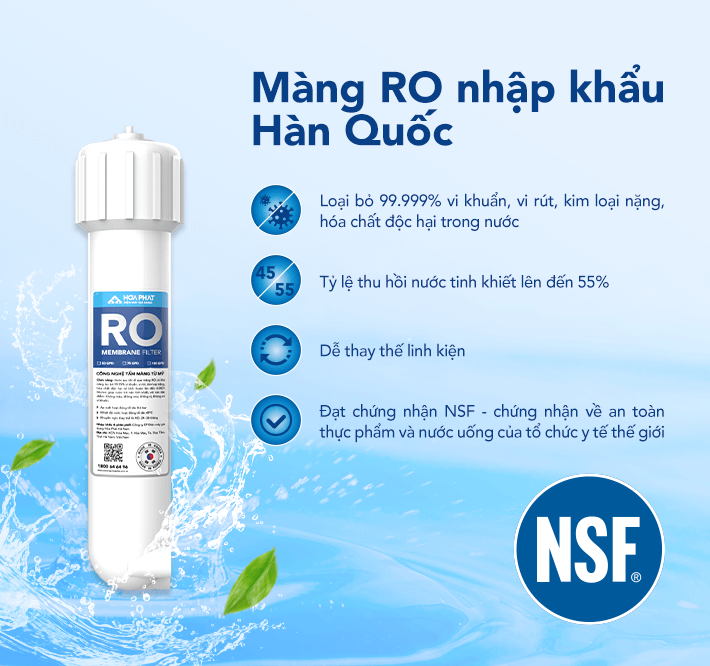 Công nghệ tấm màng từ Mỹ, đạt tiêu chuẩn quốc tế NSF/ANSI 58, loại bỏ 99.99% vi khuẩn, virus, kim loại nặng và hóa chất độc hại trong nước