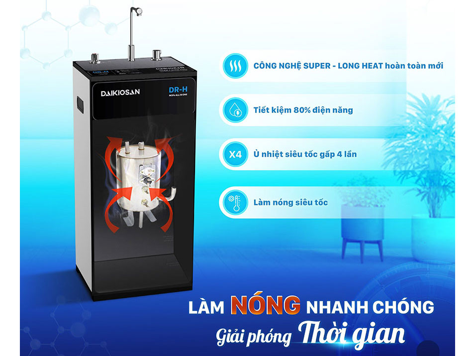 Máy lọc nước Daikiosan DN202 sử dụng công nghệ làm nóng điện trở đáy bình giúp nước được làm nóng nhanh chóng trong vòng 3 giây. Điều này không chỉ tiết kiệm thời gian mà còn tiết kiệm điện năng đáng kể. Máy lọc nước này tiết kiệm tới 80% điện năng so với các dòng máy lọc nước truyền thống, đồng thời giúp giữ nhiệt lâu hơn nhờ công nghệ “SUPER-LONG HEAT TECHNOLOGY”.