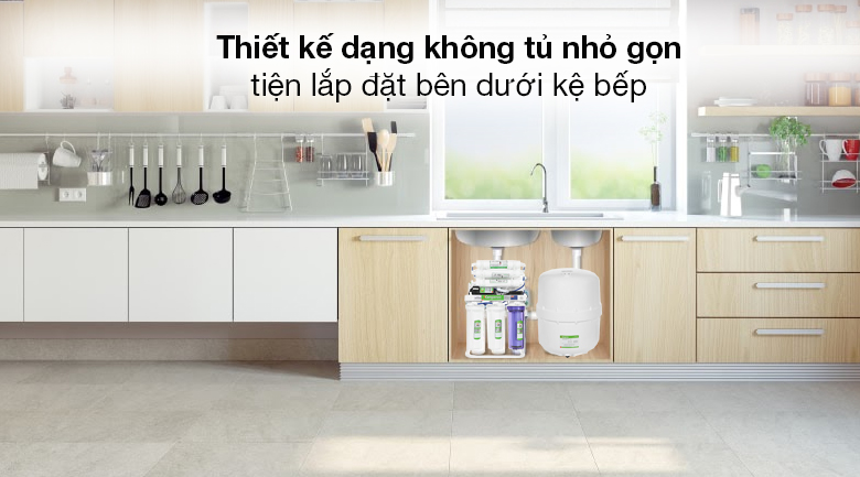Máy lọc nước âm tủ bếp cho phép lắp đặt gọn gàng bên dưới kệ bếp, tiết kiệm không gian.