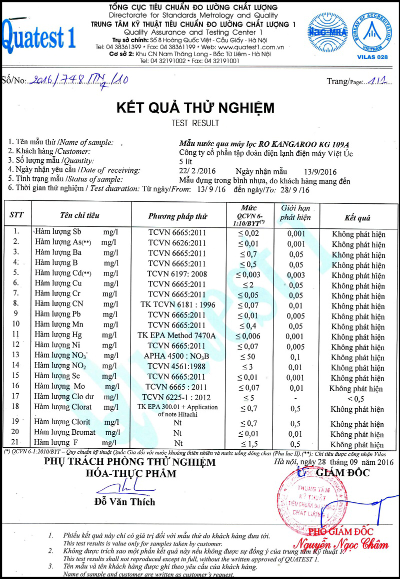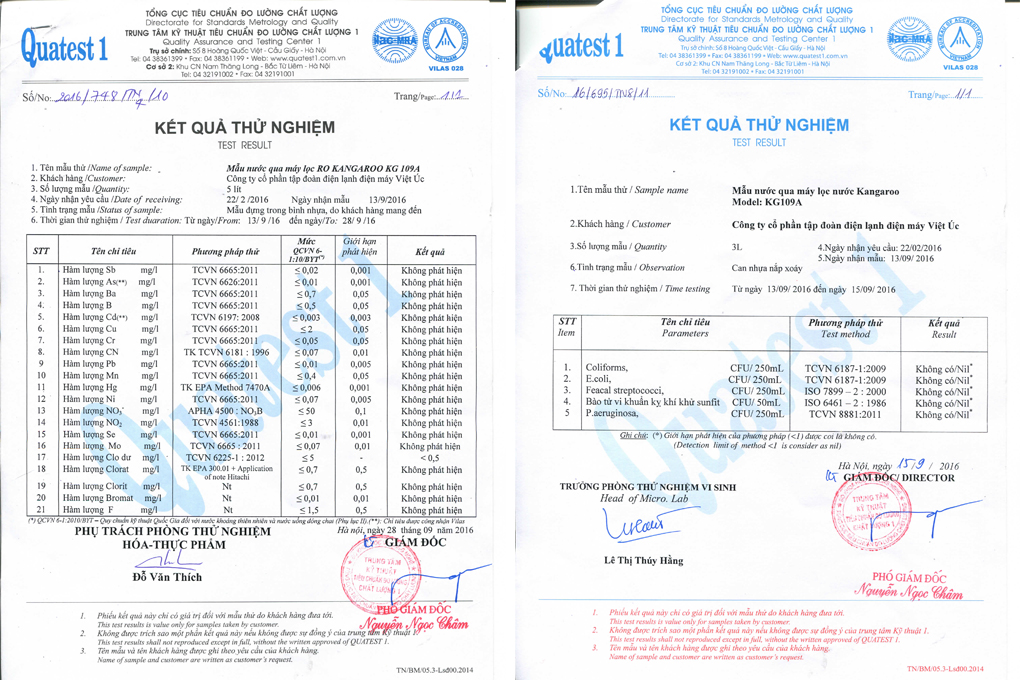 Giấy chứng nhận chất lượng nước đầu ra của máy lọc