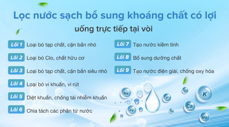 – Lõi Mineral: Bổ sung khoáng chất, tăng cường sức đề kháng cho cơ thể, làm mềm nước, giúp nước ngon hơn.