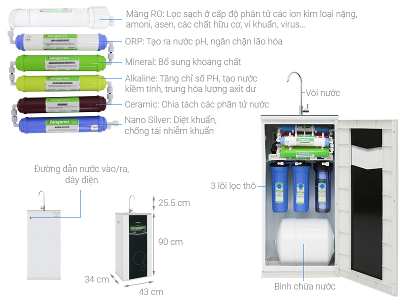 – Lõi ORP: Tạo điện giải cho nước giúp giải độc cơ thể, tăng cường đề kháng, giải khát nhanh và lâu, phát triển các mô tế bào, diệt các gốc tự do, chống lão hóa, phòng ngừa ung thư.
