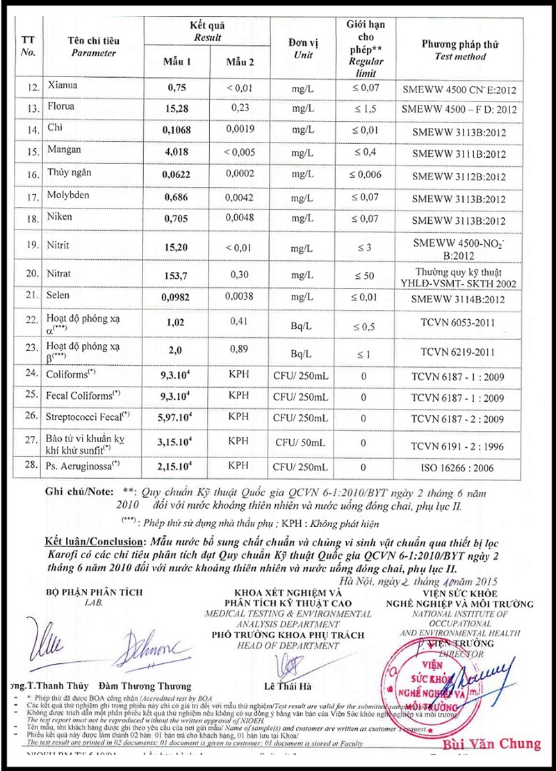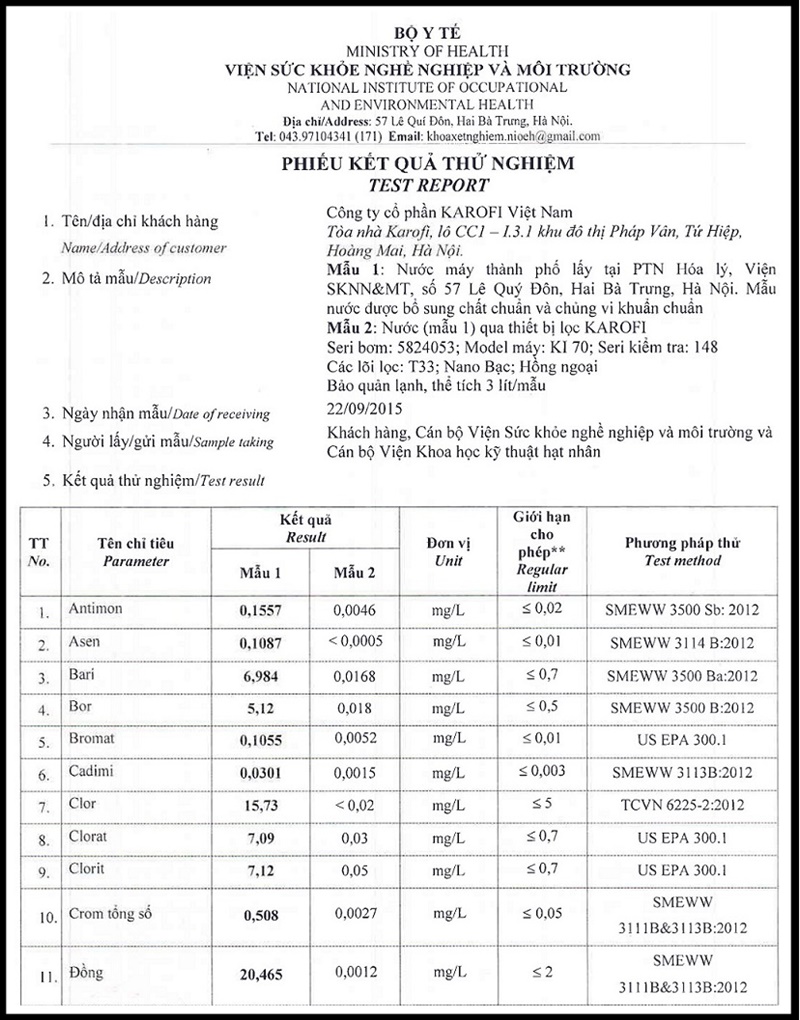 Giấy chứng nhận chất lượng nước đầu ra của máy lọc nước