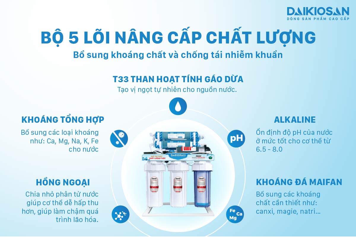 Daikiosan DSW-34009D không chỉ lọc nước mà còn giúp bổ sung khoáng chất cần thiết như canxi, magie, sắt…