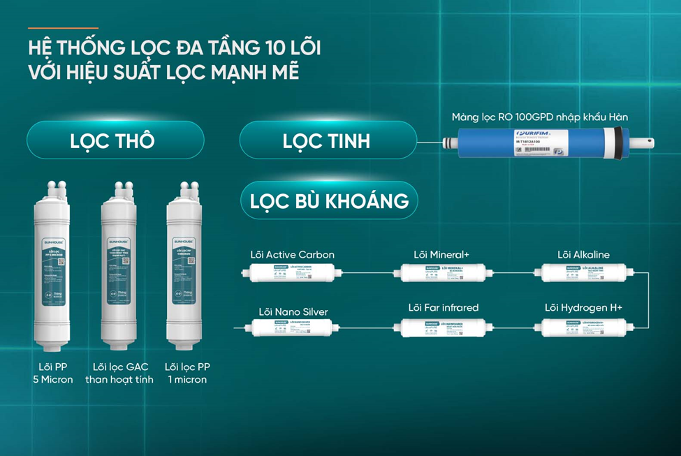 Sản phẩm được trang bị bộ 10 lõi lọc mạnh mẽ nhằm cho ra nguồn nước uống tinh khiết ngay tại vòi. Bộ lọc được chia ra thành 3 cấp độ lọc bao gồm: cấp lọc thô, cấp lọc tinh và cấp lọc bù khoáng: