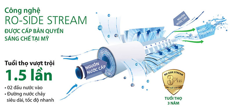 Màng lọc RO – Side Stream thẩm thấu ngược hiện đại, loại bỏ 99.9 % kim loại nặng và vi khuẩn có hại trong nước, làm tăng thêm tới 66 % lượng nước tinh khiết, giảm 56 % lượng nước thải ra. Có tỉ lệ thu hồi nước tinh khiết và nước thải là 1:1, tức 10 lít nước lọc thì sẽ cho 5 lít nước tinh khiết và 5 lít nước thải.
