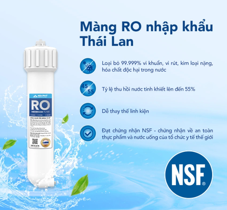 - Máy lọc nước Hòa Phát HPN629 sử dụng màng lọc RO hàng đầu từ Hitech Thái Lan giúp loại bỏ 99.999% vi khuẩn vi rút, kim loại năng, hóa chất độc hại trong nước. Tỉ lệ thu hồi bước tinh khiết lên tới 55%. Thiết kế dễ dàng thay thế linh kiện. Đạt chứng nhận NSF – Chứng nhận về an toàn thực phẩm và nước uống của tổ chức y tế thế giưới WHO.