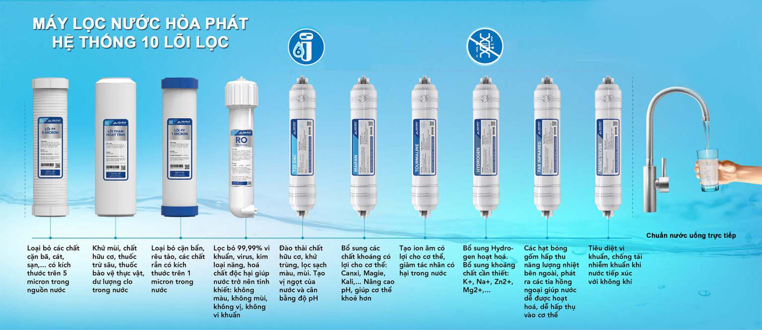 Hệ thống 10 lõi lọc của máy lọc nước RO nóng nguội lạnh Hòa Phát HPN685.