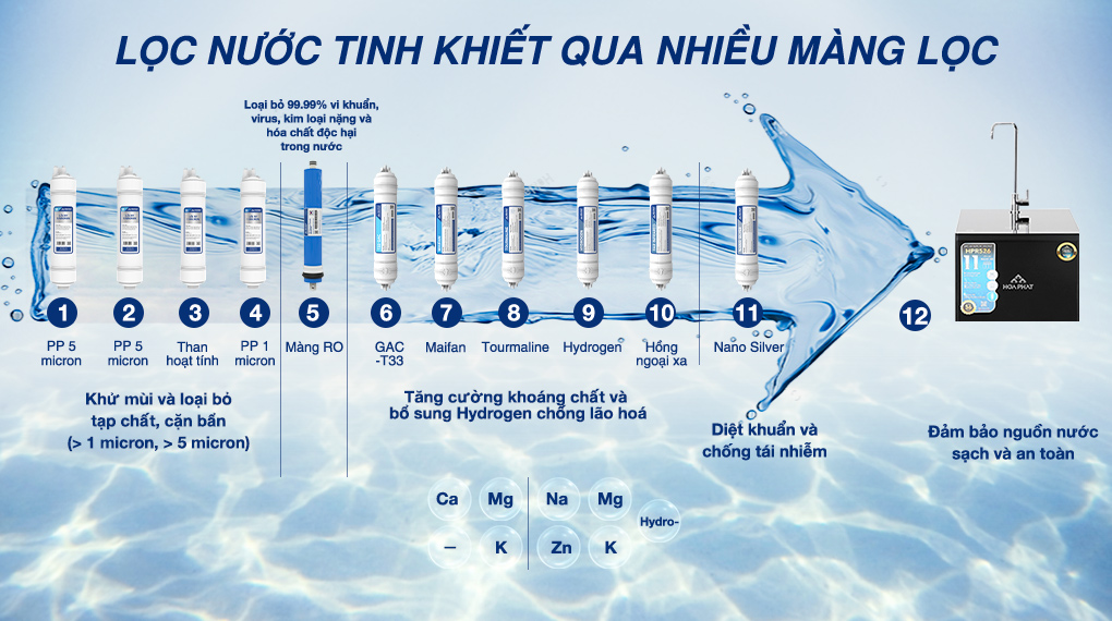 Máy lọc nước RO Hòa Phát HPR526 11 lõi sử dụng công nghệ lọc thẩm thấu ngược RO và công nghệ diệt khuẩn Nano Silver đem đến cho bạn nguồn nước lọc đạt tiêu chuẩn QCVN 6-1:2010/BYT của Bộ Y tế có thể uống trực tiếp. Ngoài ra, nước sau lọc còn được bổ sung Hydrogen giúp trung hòa axit và loại bỏ các tác nhân gây hại. Đây sẽ là một sản phẩm đáng cân nhắc cho nhu cầu sử dụng nước sạch, an toàn của gia đình bạn.