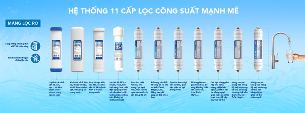 Hệ thống 11 lõi lọc của máy lọc nước RO tủ đứng Hòa Phát HPR528