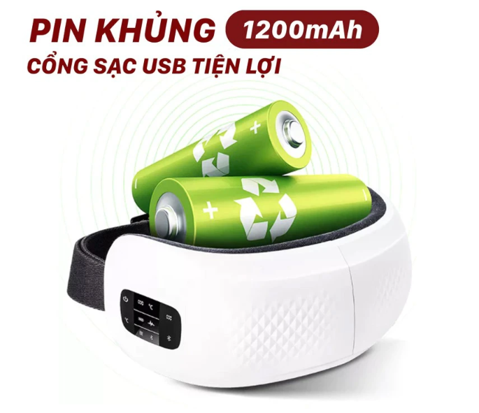 Máy massage mắt sử dụng pin sạc điện với dung lượng 1.200mAh, thời gian sạc 2 giờ, khi đầy pin bạn có thể sử dụng khoảng 7 – 8 lần, mỗi lần 15 phút.