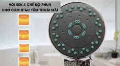 Vòi sen có tính năng chống khuẩn và có lực phun mạnh mẽ, với 4 kiểu phun để người dùng lựa chọn. Bên cạnh 2 kiểu phun thông thường, vòi còn có 2 kiểu phun massage giúp người dùng xua tan mệt mỏi và thư giãn một cách thoải mái nhất là sau những giờ học tập, làm việc căng thẳng. (Xem thêm Công dụng của tính năng chống khuẩn vòi sen).