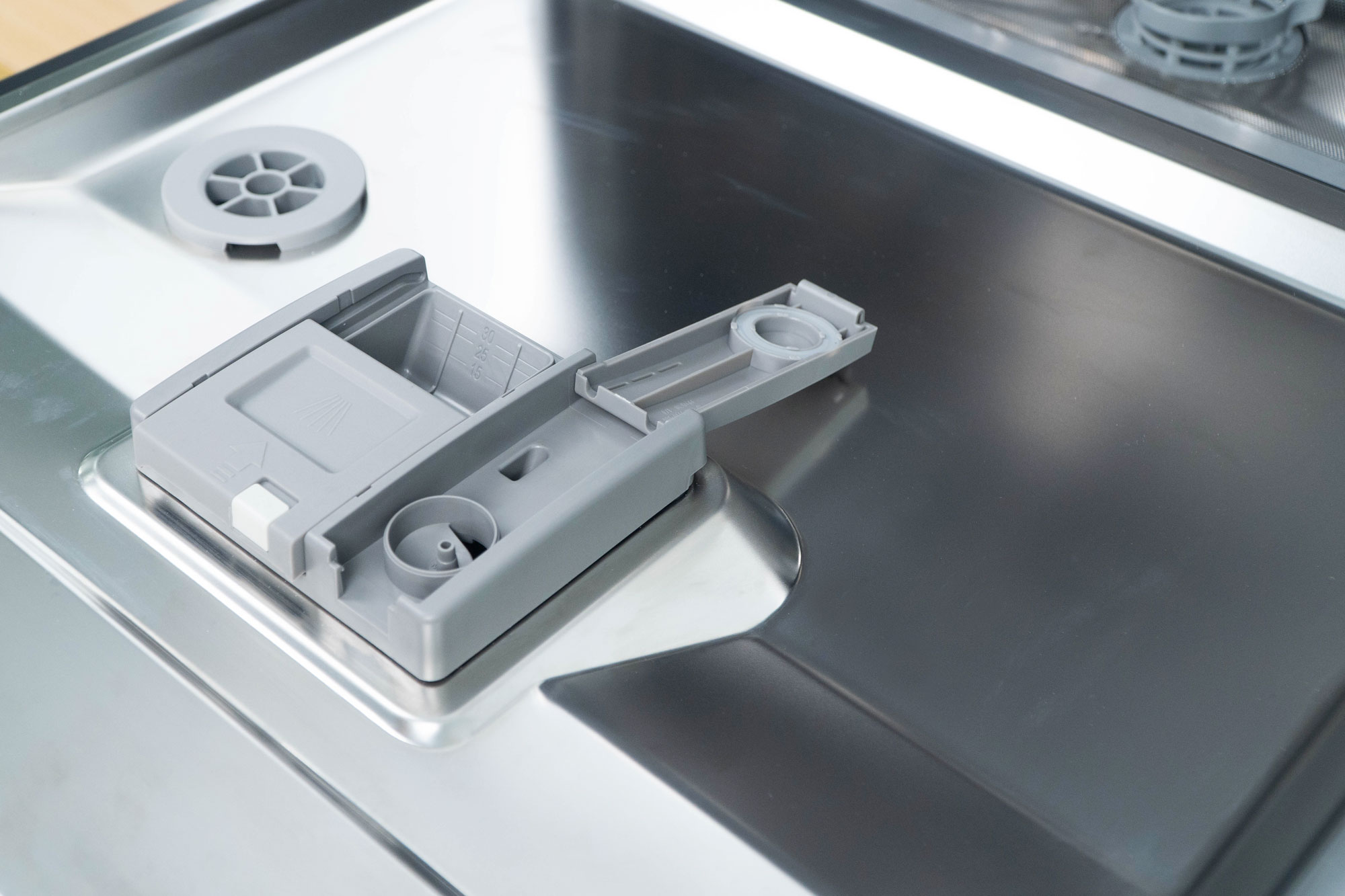 Bên cạnh đó, phần cánh cửa đóng mở có ngăn đựng chất làm bóng và ngăn đựng viên tẩy rửa. Chất làm bóng giúp cho bát đĩa được sáng và bóng hơn, trong khi đó viên tẩy rửa là chất liệu quan trọng để đánh sạch mọi vết bẩn.