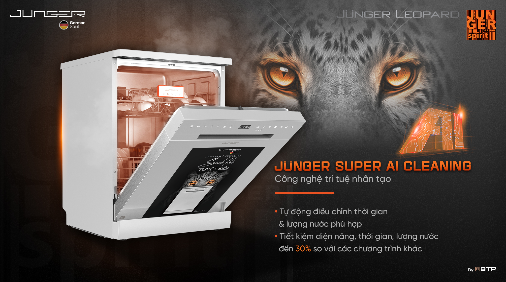 - Chế độ rửa tự động AI (Junger Super AI Cleaning): Một trong những tính năng nổi bật của máy là chế độ rửa tự động sử dụng công nghệ trí tuệ nhân tạo (AI). Công nghệ này giúp máy tự động nhận diện độ bẩn của bát đĩa và tự điều chỉnh thời gian và lượng nước rửa phù hợp, mang đến hiệu quả làm sạch tối ưu và tiết kiệm nước, điện năng.