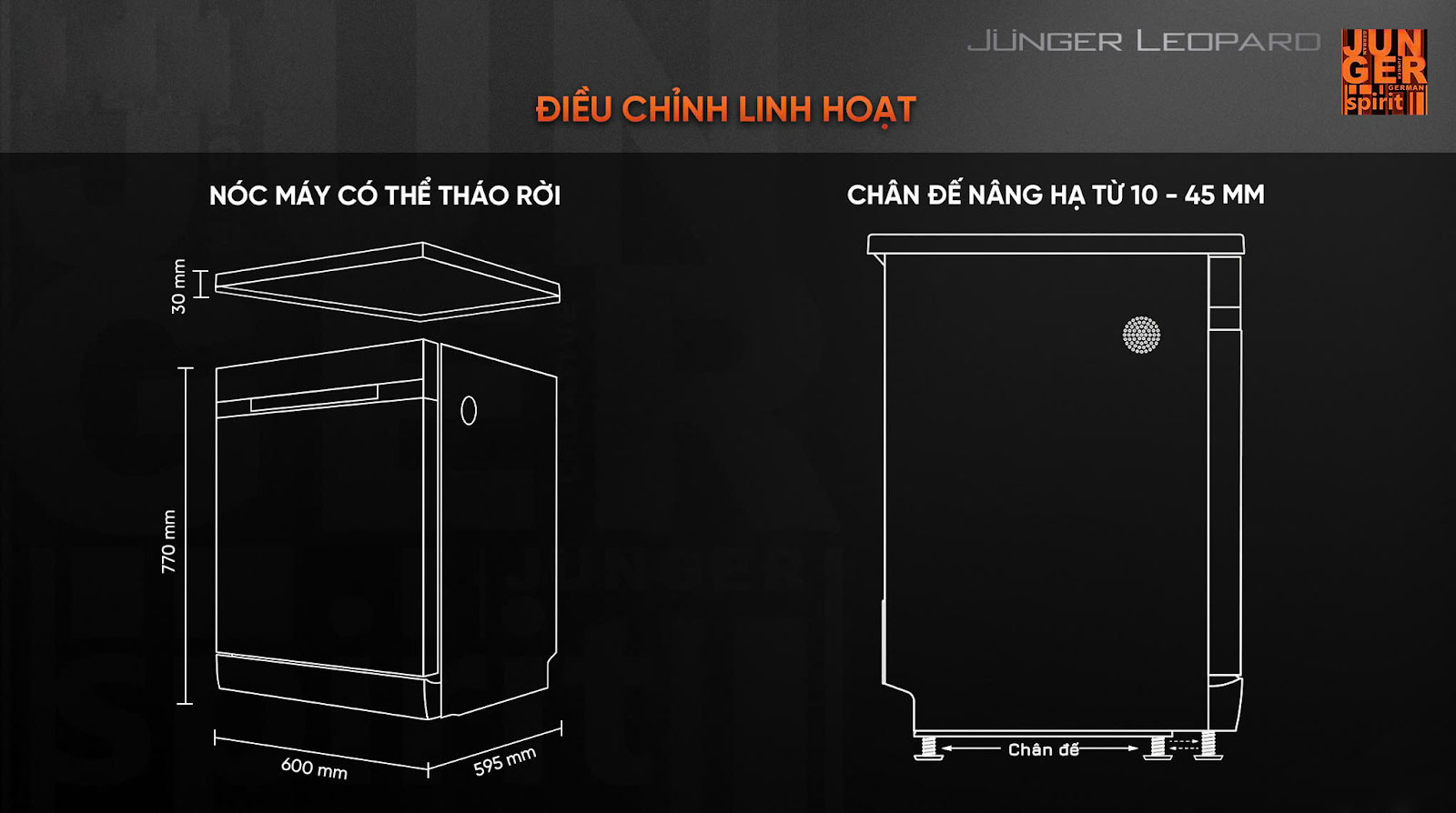 Máy rửa bát Junger Leopard DWJ-183-VG được thiết kế theo triết lý Bauhaus của Đức với vẻ ngoài tinh tế, hiện đại và đầy sang trọng. Đặc biệt, máy có thể lắp âm tủ hoặc đặt độc lập, giúp dễ dàng kết hợp với mọi phong cách nội thất.