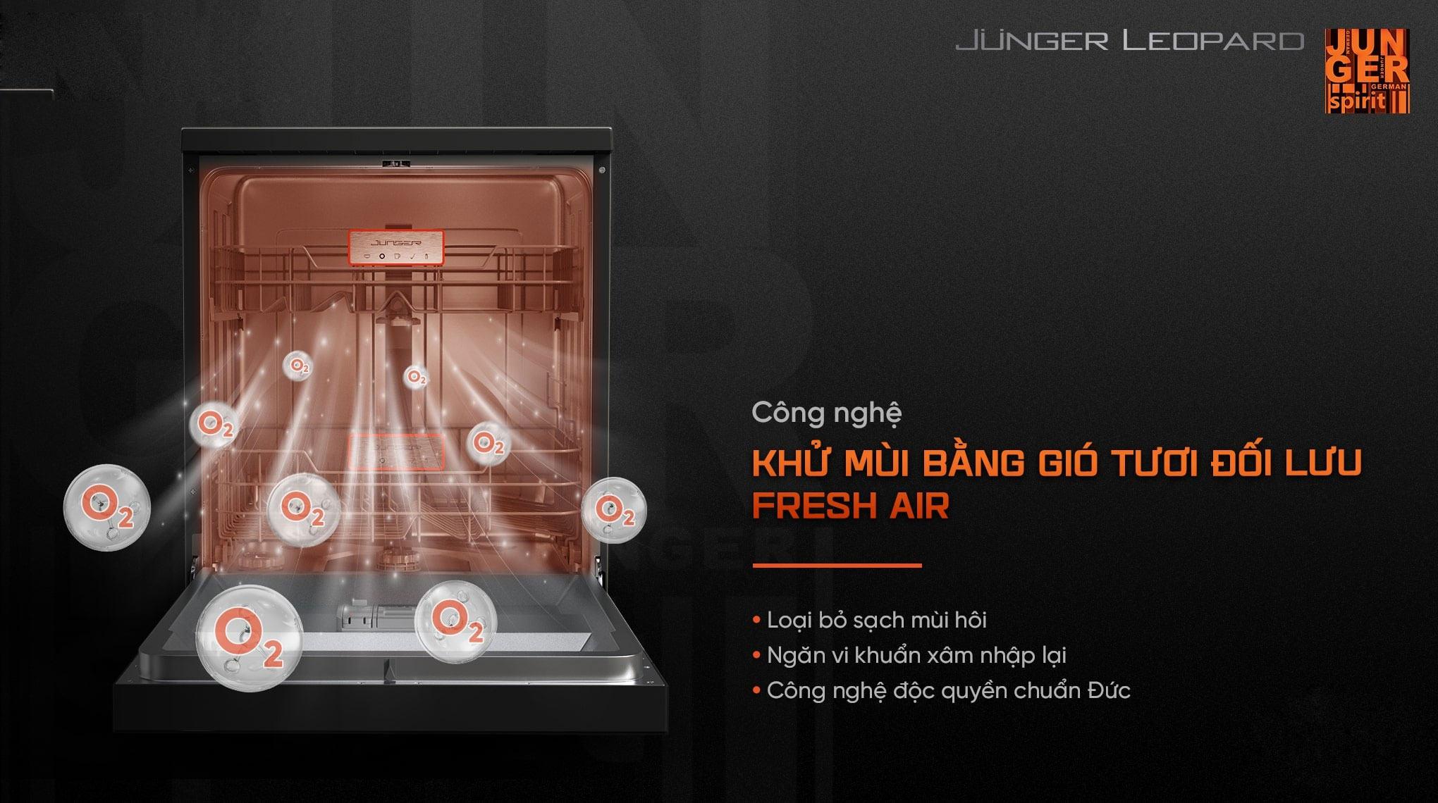 Ngoài ra, công nghệ sấy khô Junger Super Dry Tech kết hợp với hệ thống quạt gió đối lưu giúp bát đĩa khô nhanh chóng, không còn đọng nước sau mỗi chu trình rửa. Công nghệ này mang lại sự tiện lợi tối đa cho người sử dụng, không còn phải lo lắng về việc lau khô bát đĩa sau khi rửa.