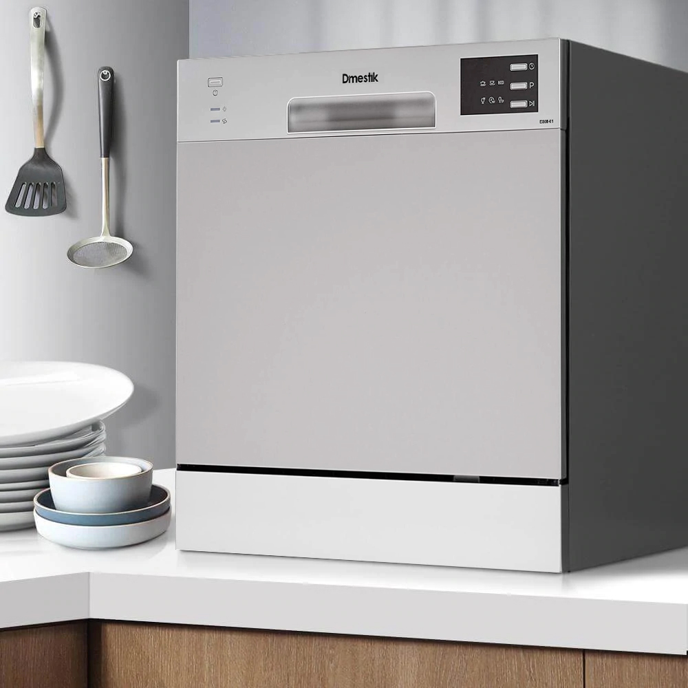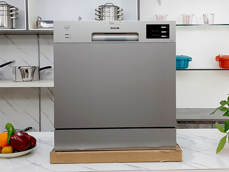 Máy rửa bát Dmestik 8 bộ sở hữu màu bạc sang trọng, bảng điều khiển cơ và cảm ứng dễ sử dụng, có màn hình Led hiển thị.