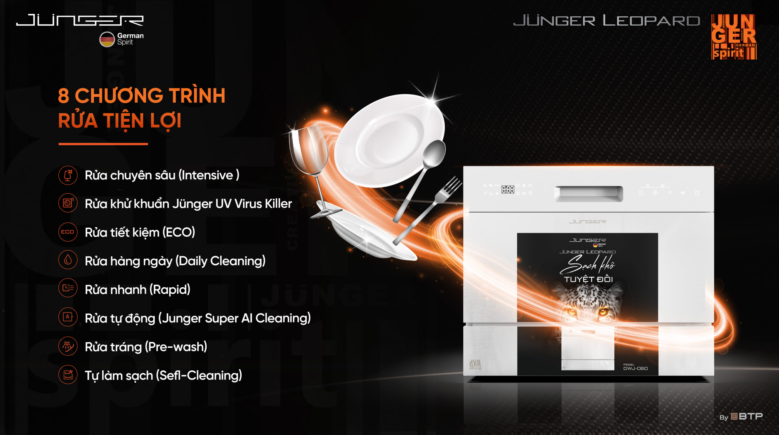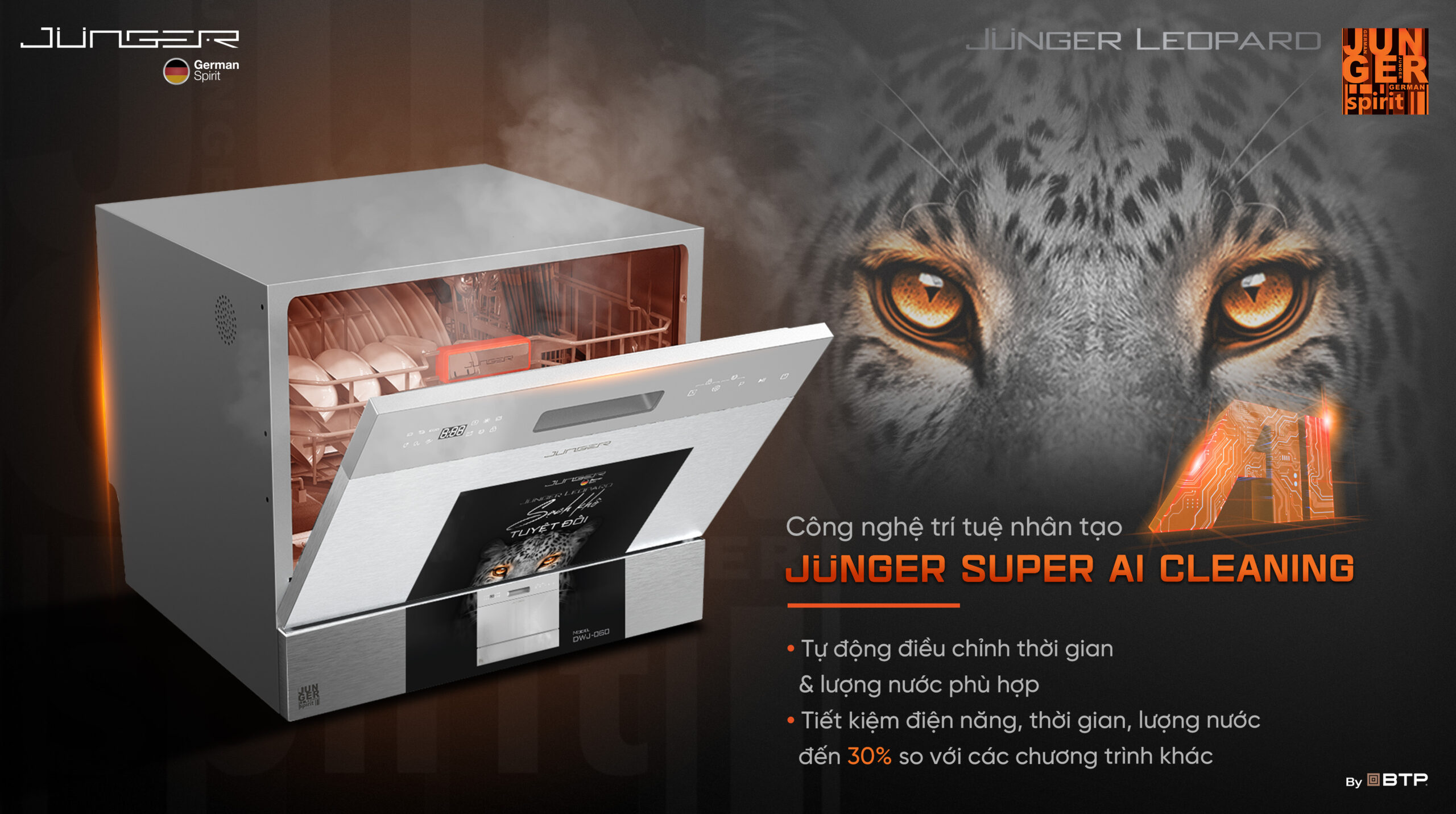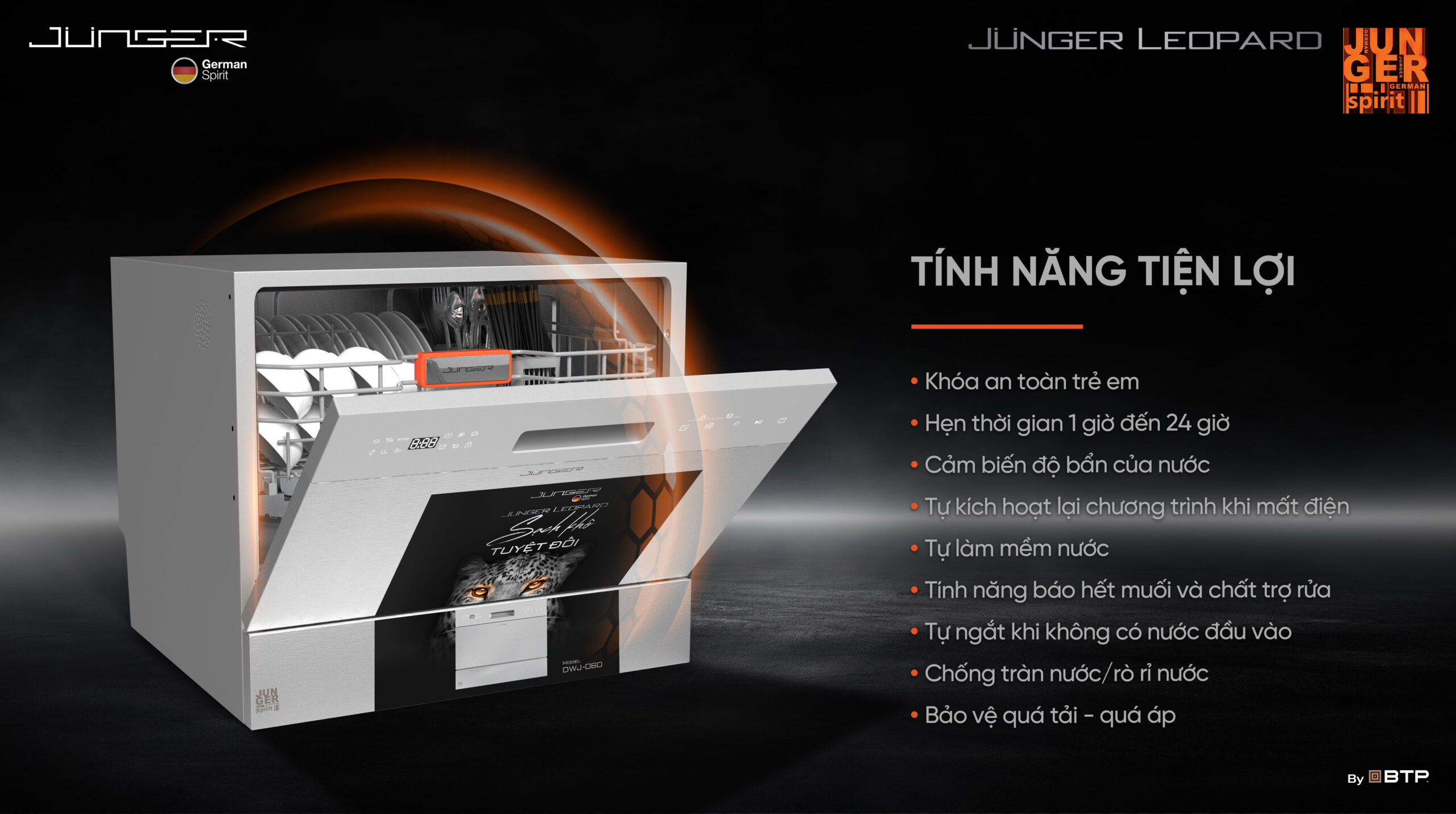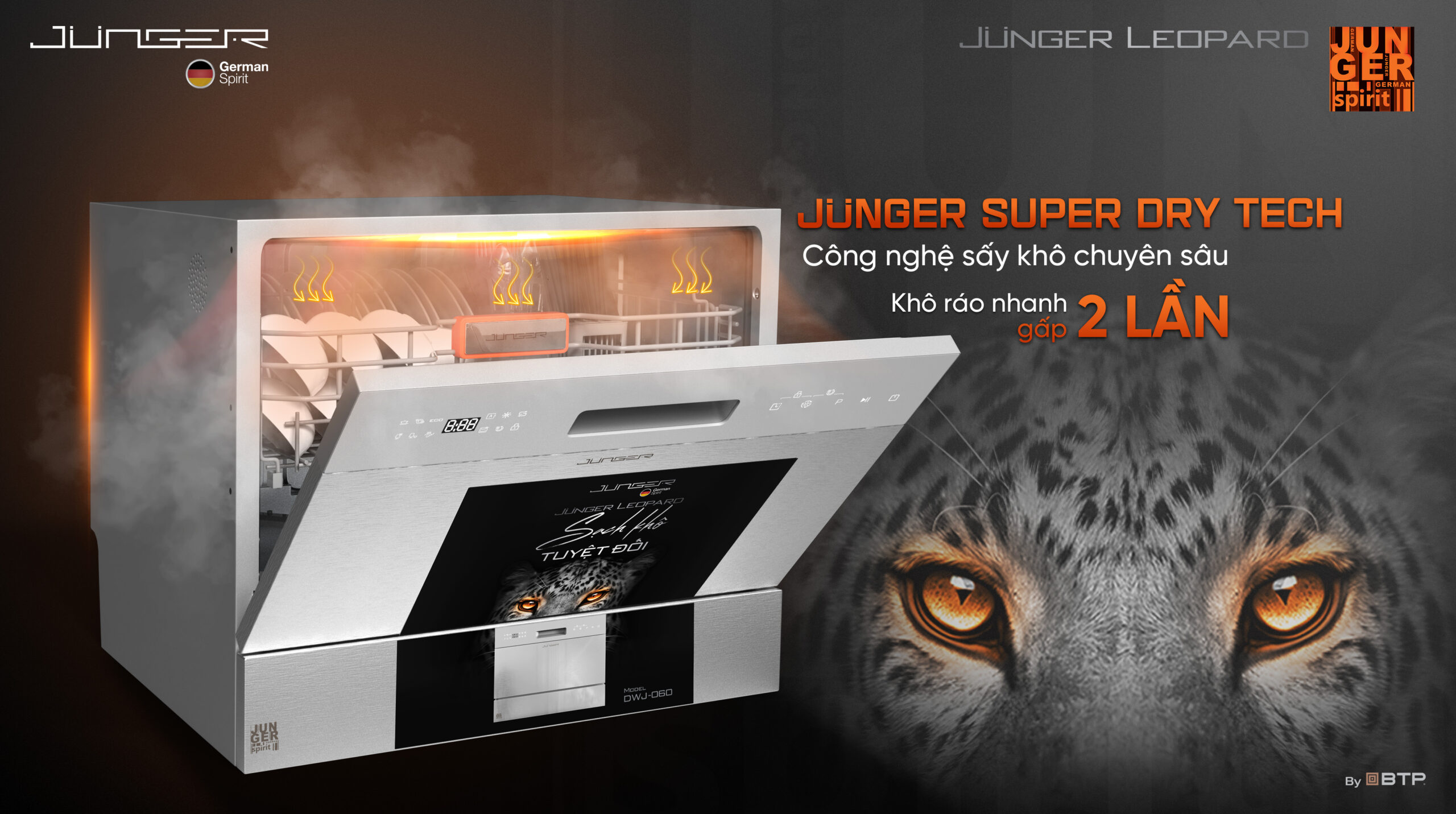 Máy rửa bát Junger Leopard DWJ-060 “Sạch khô tuyệt đối” được ứng dụng những công nghệ Junger tiên tiến bậc nhất, sở hữu những tính năng vượt trội, hứa hẹn sẽ biến việc dọn dẹp sau mỗi bữa ăn trở nên nhẹ nhàng và nhanh chóng hơn bao giờ hết.