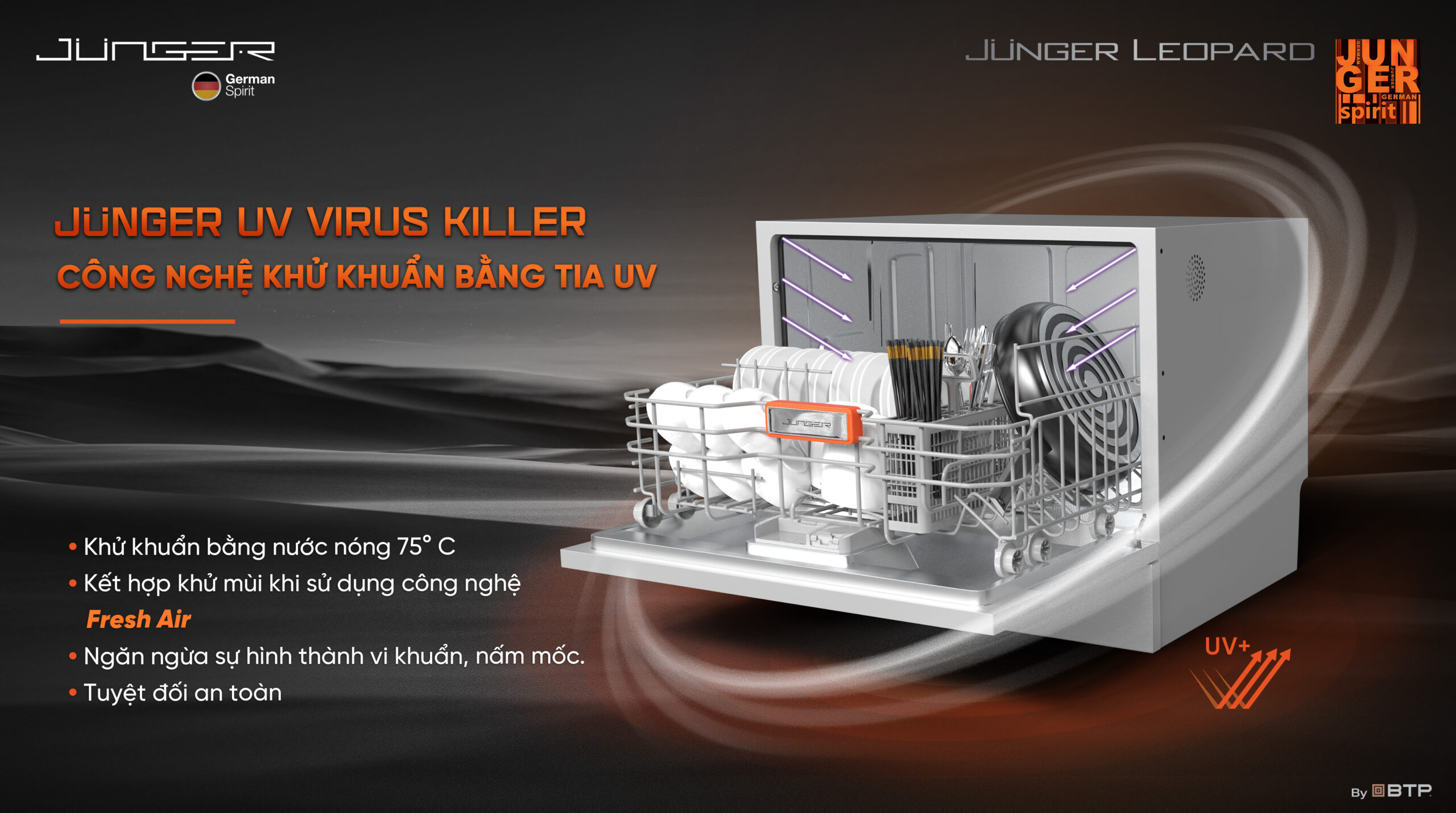Chức năng khử trùng/diệt khuẩn bằng công nghệ Junger UV Virus Killer Tech có khả năng tiêu diệt đến 99,9% vi khuẩn, ngăn chặn sự hình thành vi khuẩn, nấm mốc và ngăn ngừa mùi hôi bám trên bát đĩa. Từ đó mang đến sự an toàn tuyệt đối cho người sử dụng. Công nghệ này được kích hoạt khi sử dụng chức năng Rửa khử khuẩn 75 độ và chức năng khử mùi bằng gió tươi đối lưu Fresh Air.