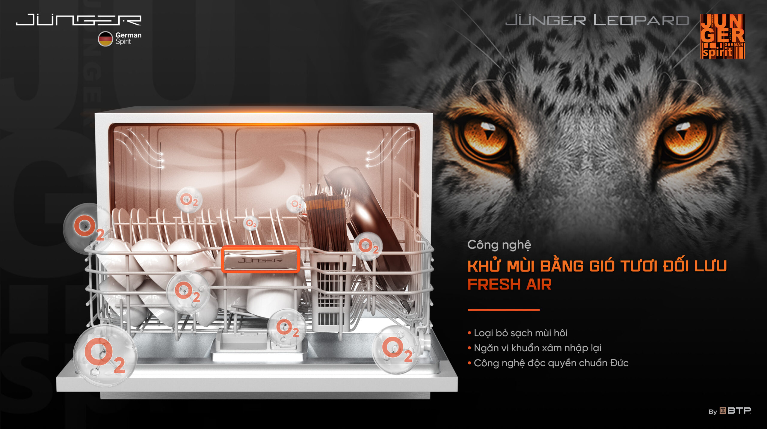 Công nghệ khử mùi bằng gió tươi đối lưu Fresh Air kèm sấy nóng sau khi rửa ngăn ngừa sự ngưng tụ hơi nước lên bát đĩa, ngăn ngừa sự hình thành vi khuẩn, nấm mốc. Giúp ngăn ngừa mùi hôi bám lên bát đĩa hoặc trong khoang máy mà không cần phải mở cửa khoang máy. Kết hợp với công nghệ khử trùng/diệt khuẩn bằng công nghệ Junger UV Virus Killer Tech đem lại hiệu quả sạch và khô tuyệt đối.