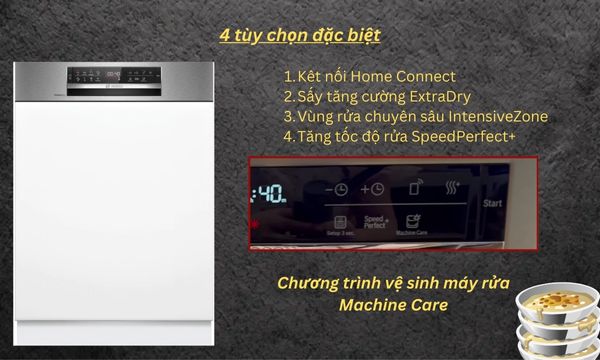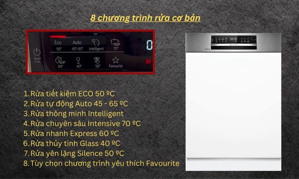 8 chương trình rửa đa dạng và 4 tùy chọn bổ sung thông minh của máy rửa chén bát Bosch SMI6ZCS16E giúp tiết kiệm thời gian và công sức dọn dẹp sau nấu, mang đến trải nghiệm vận hành hoàn hảo.