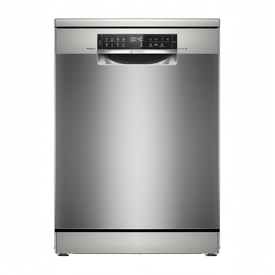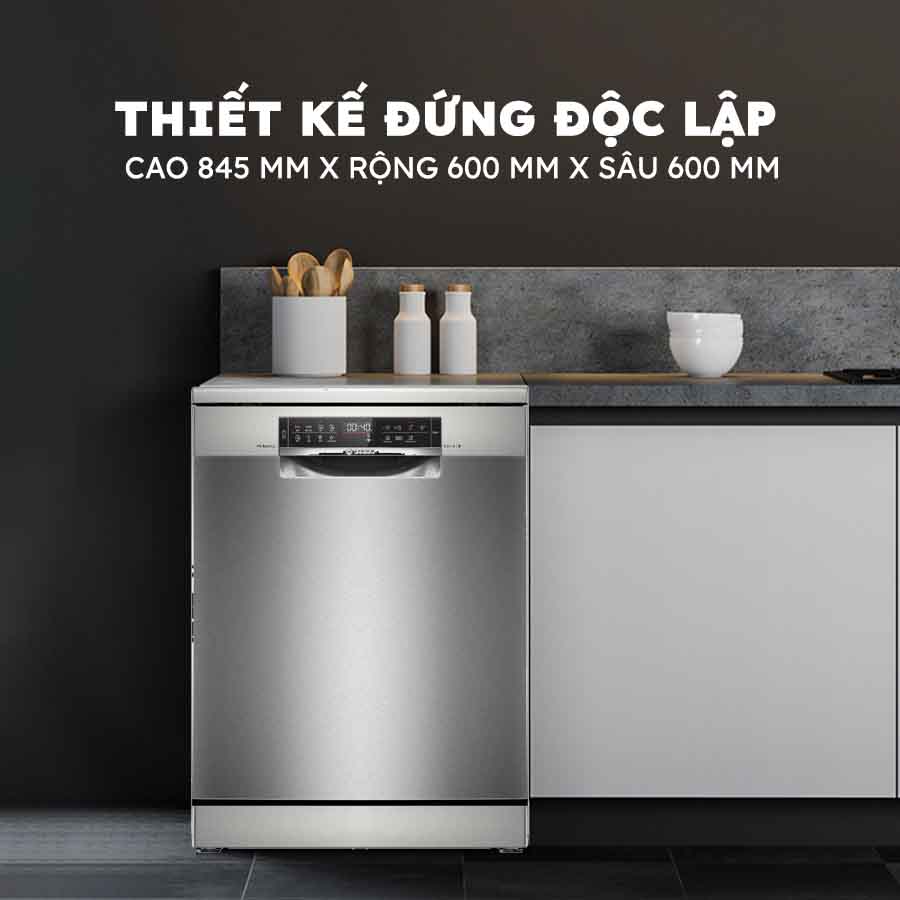 Máy rửa chén Bosch SMS6ZCI85M kiểu dáng hình hộp chữ nhật đứng gọn đẹp, màu bạc tinh tế. Với thiết kế độc lập, mẫu máy rửa bát Bosch này mang đến sự linh hoạt tối đa trong lắp đặt, cho phép bạn bố trí ở bất kỳ vị trí nào trong không gian bếp. Gam màu bạc trang nhã không chỉ tôn lên vẻ đẹp hiện đại của sản phẩm mà còn dễ dàng kết hợp với mọi phong cách nội thất, tạo điểm nhấn ấn tượng cho căn bếp nhà bạn.