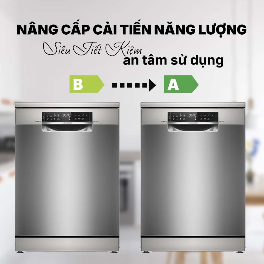 Không chỉ tích hợp các công nghệ rửa sấy hiện đại và tính năng thông minh, Bosch SMS6ZCI85M còn được nâng cấp với hiệu suất tiết kiệm năng lượng cao, đạt nhãn A năng lượng. Nhờ công nghệ tiên tiến, máy hoạt động mạnh mẽ nhưng vẫn tối ưu điện năng, giúp bạn tiết kiệm chi phí sử dụng.