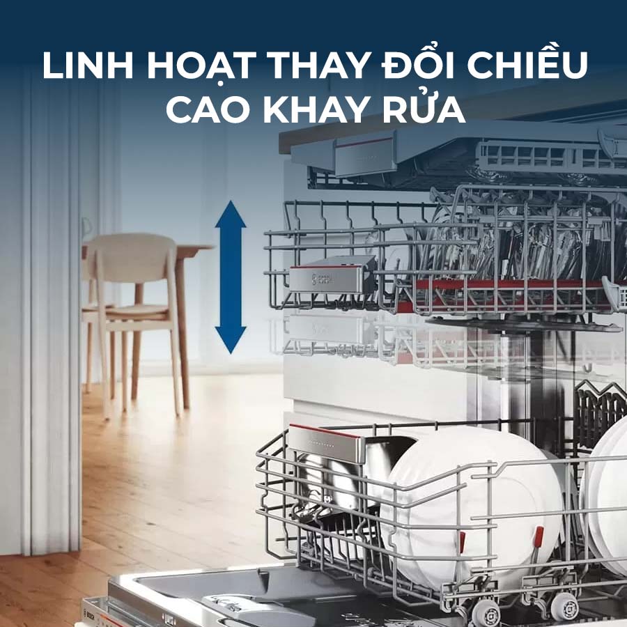 Hệ thống khay rửa có thể thay đổi chiều cao linh hoạt, thuận tiện khi xếp bát đĩa
