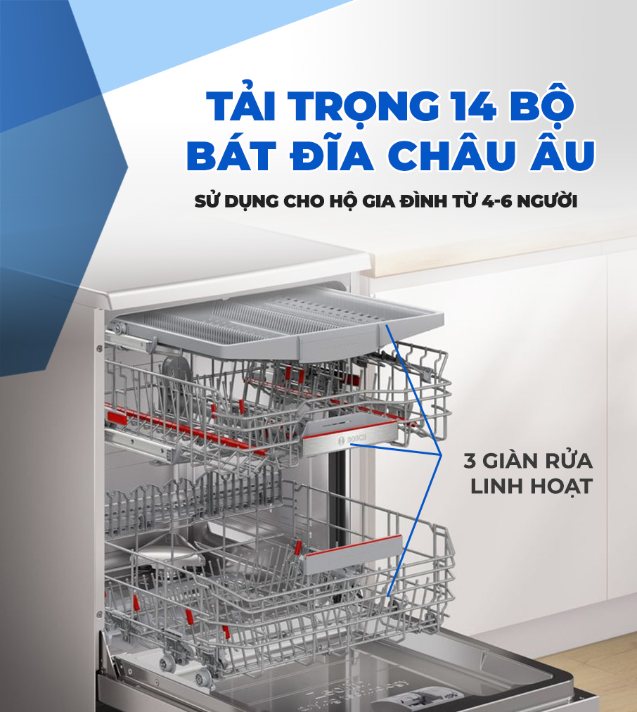 – Máy rửa chén độc lập Bosch SMS6ZCI85M có thể rửa được 3 – 4 bữa ăn Việt (14 bộ châu Âu), đáp ứng tốt nhu cầu sử dụng cho những gia đình đông thành viên.